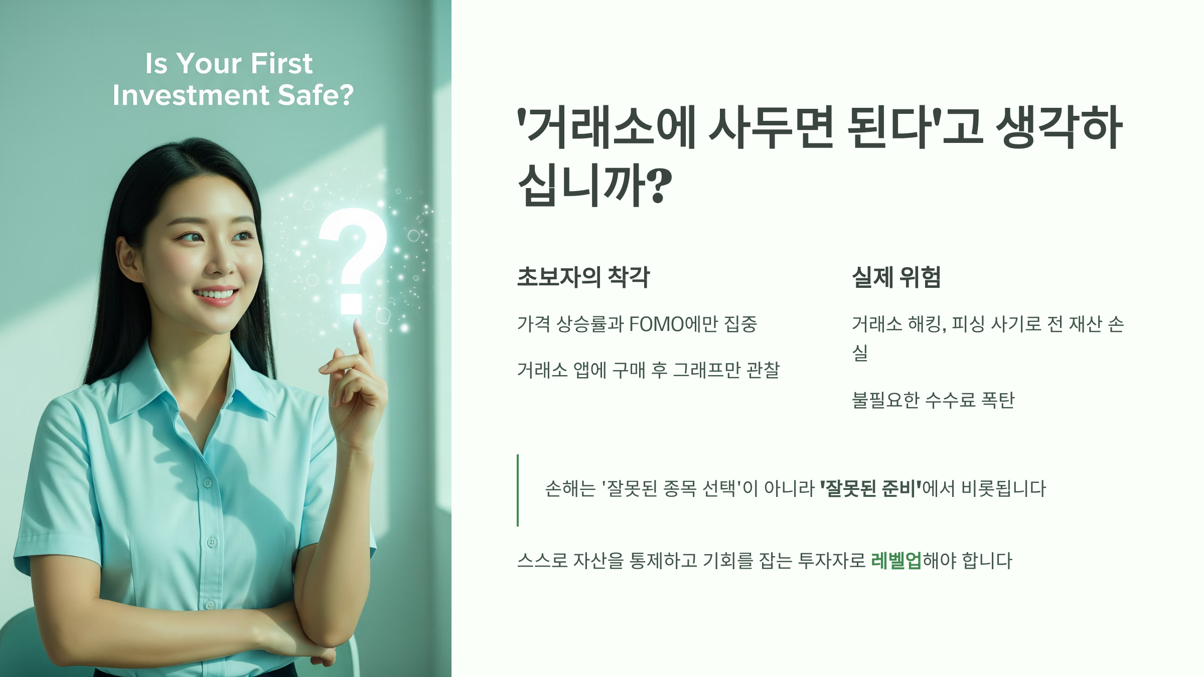 그러나 이것은 매우 위험한 접근 방식입니다. 투자의 초기 단계에서 발생하는 손해는 대부분 '잘못된 종목 선택'이 아니라 '잘못된 준비'에서 비롯됩니다. 거래소 해킹, 피싱 사기로 인한 전 재산 손실, 혹은 불필요한 수수료 폭탄 등은 모두 '이것'을 몰랐기 때문에 발생하는 수백만원 단위의 손해입니다.