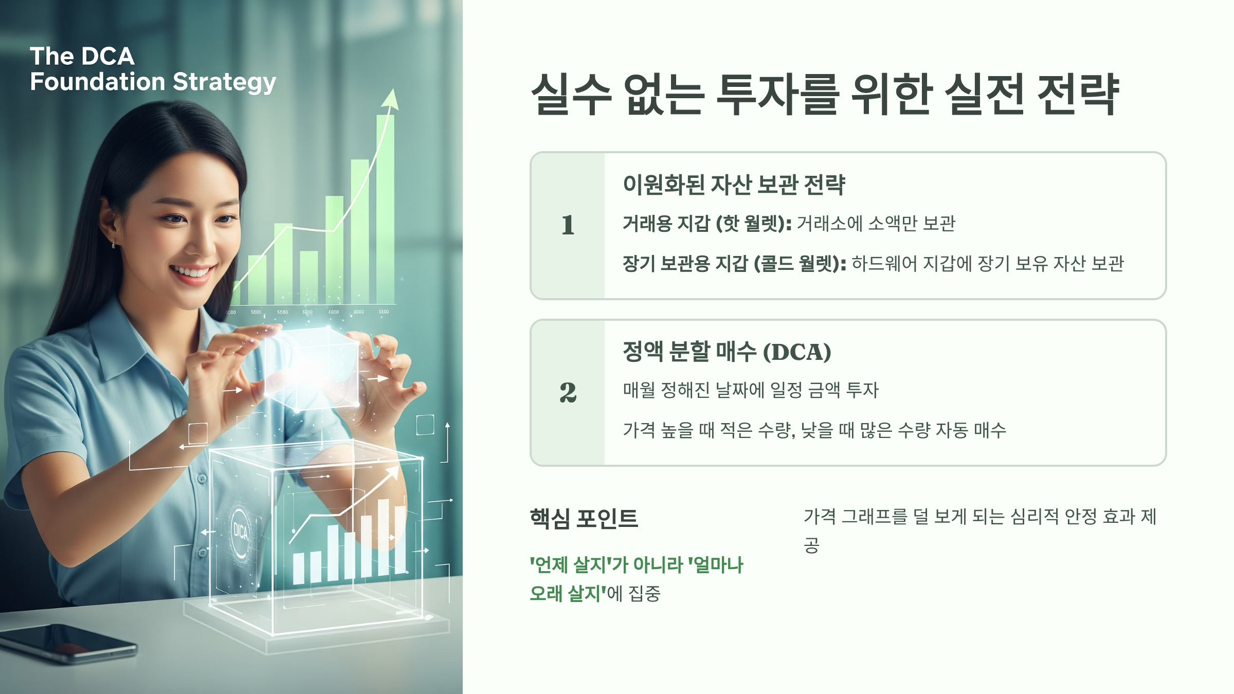 자산을 지키고 꾸준히 성장시키기 위해 왕초보가 가장 먼저 적용해야 할 두 가지 실전 전략을 제시합니다.