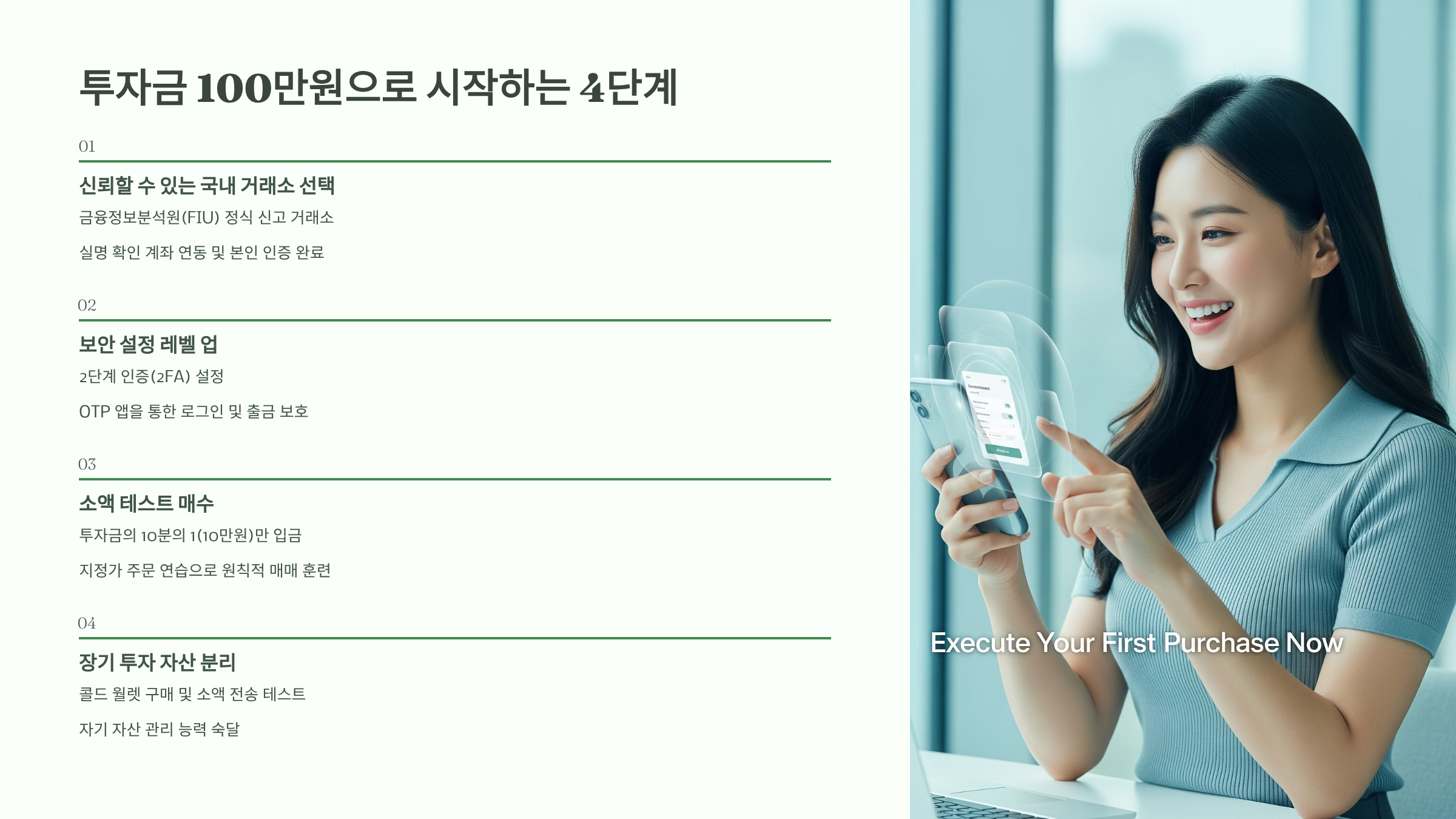 아래 단계를 그대로 따라 하면, 위험을 최소화하고 비트코인 투자를 즉시 시작할 수 있습니다.
