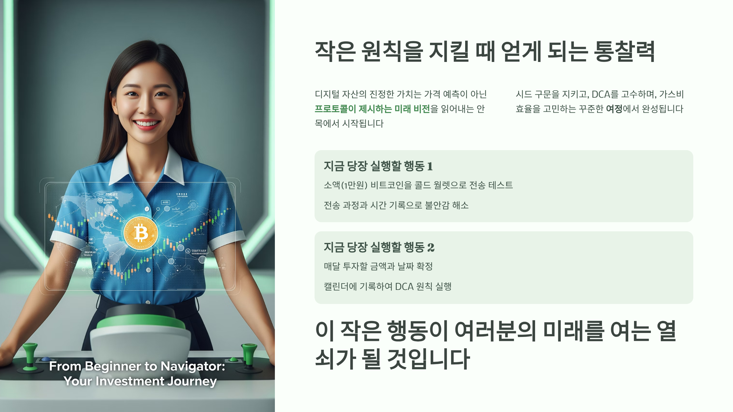 이 지식은 이제 여러분의 무기가 될 것입니다. 막연했던 '비트코인 투자'는 이제 스스로 통제 가능한 구체적인 행동 영역으로 바뀌었습니다.