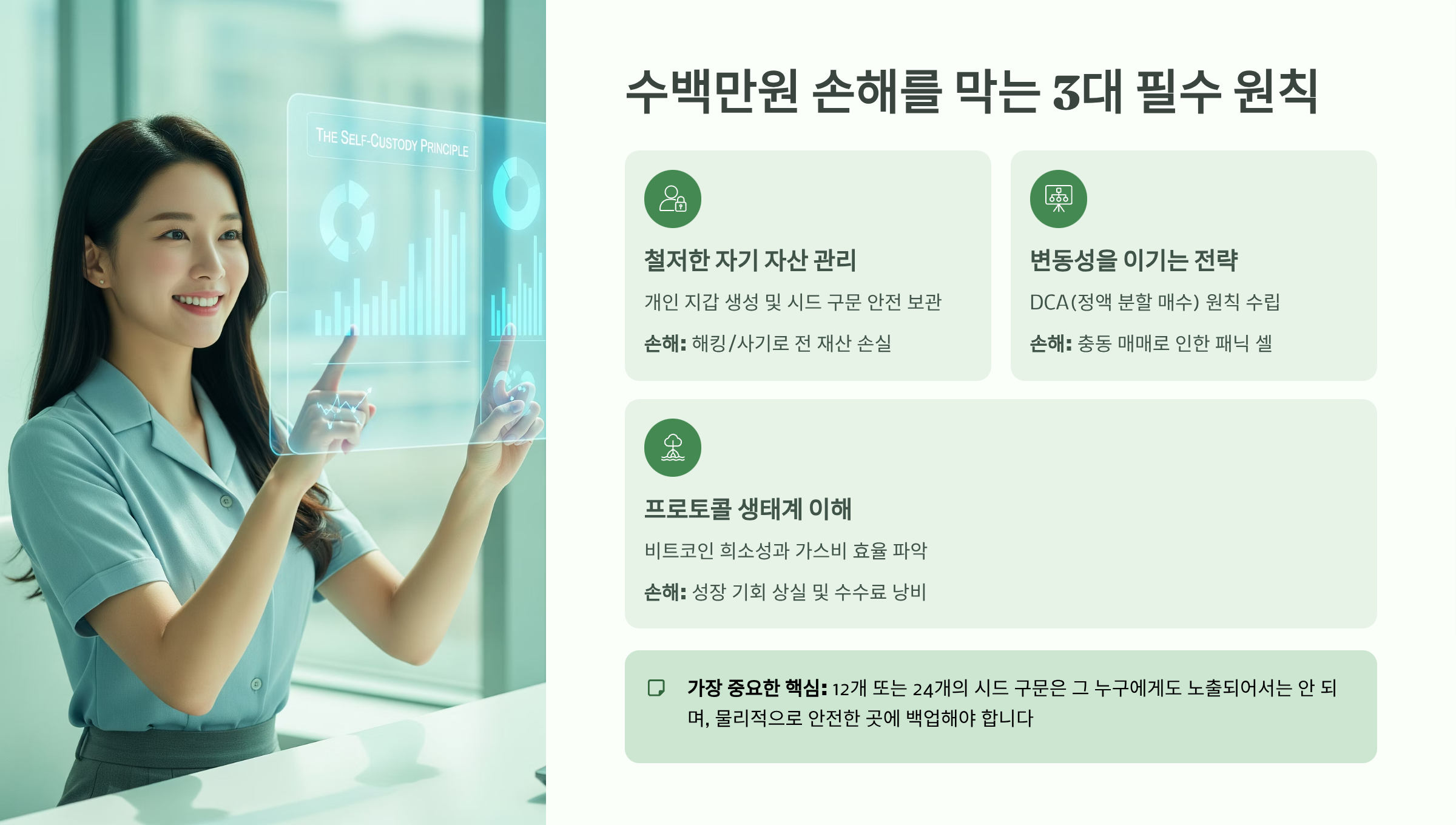 우리는 이 글을 통해 '비트코인을 사서 돈을 번다'는 막연한 기대 대신, '이것'을 모르면 손해 볼 수 있는 3가지 필수 원칙(보안, 전략, 이해)을 학습하고, 초보자가 흔히 겪는 수백만원의 손실 위험을 회피했습니다.